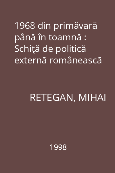 | Titlu | 1968 din primăvară până în toamnă : Schiţă de politică externă românească |