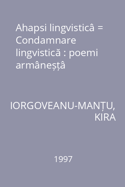 | Titlu | Ahapsi lingvisticâ = Condamnare lingvistică : poemi armâneșțâ |