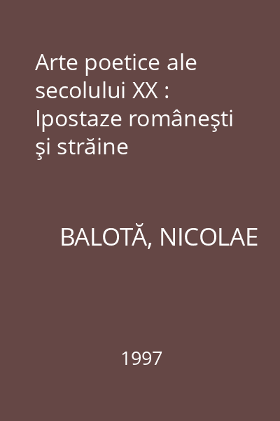 | Titlu | Arte poetice ale secolului XX : Ipostaze româneşti şi străine |