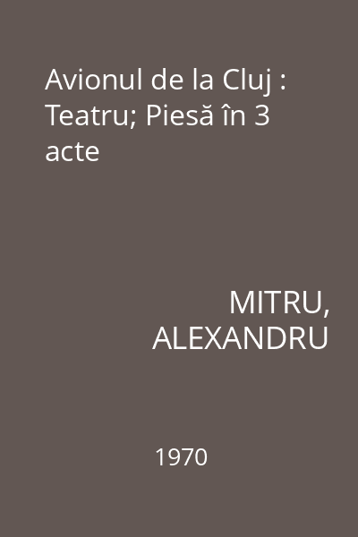 | Titlu | Avionul de la Cluj : Teatru; Piesă în 3 acte |