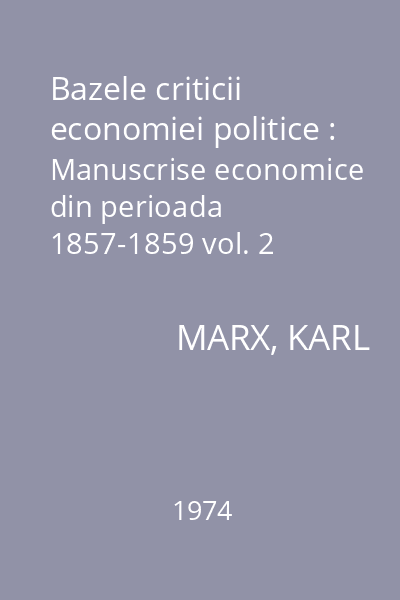 | Titlu | Bazele criticii economiei politice : Manuscrise economice din perioada 1857-1859 vol. 2 |