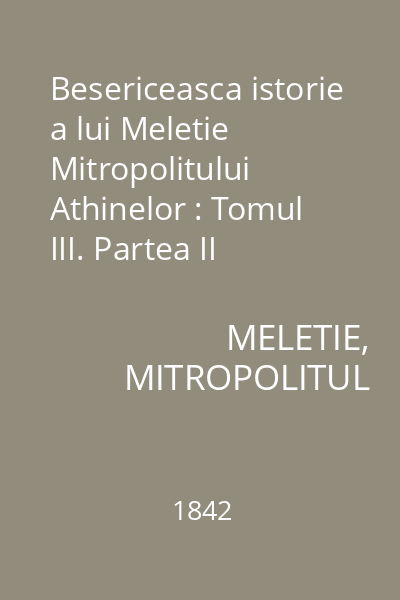 | Titlu | Besericeasca istorie a lui Meletie Mitropolitului Athinelor : Tomul III. Partea II |