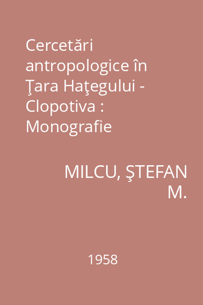 | Titlu | Cercetări antropologice în Ţara Haţegului - Clopotiva : Monografie |