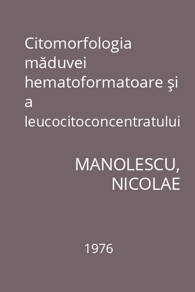 | Titlu | Citomorfologia măduvei hematoformatoare şi a leucocitoconcentratului la animale |