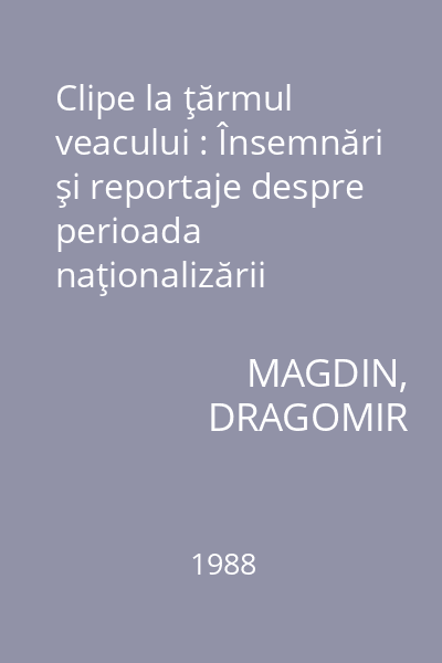 | Titlu | Clipe la ţărmul veacului : Însemnări şi reportaje despre perioada naţionalizării |