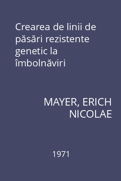 | Titlu | Crearea de linii de păsări rezistente genetic la îmbolnăviri |