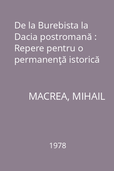 | Titlu | De la Burebista la Dacia postromană : Repere pentru o permanenţă istorică |
