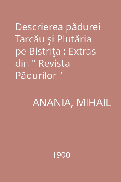 | Titlu | Descrierea pădurei Tarcău şi Plutăria pe Bistriţa : Extras din " Revista Pădurilor " |