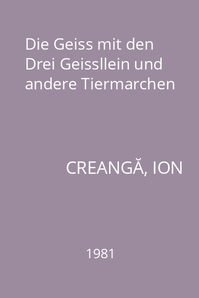 | Titlu | Die Geiss mit den Drei Geissllein und andere Tiermarchen |