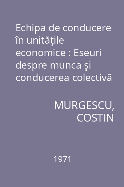 | Titlu | Echipa de conducere în unităţile economice : Eseuri despre munca şi conducerea colectivă |