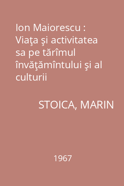 | Titlu | Ion Maiorescu : Viaţa şi activitatea sa pe tărîmul învăţămîntului şi al culturii |