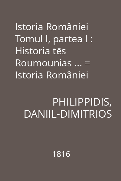 | Titlu | Istoria României Tomul I, partea I : Historia tēs Roumounias ... = Istoria României |