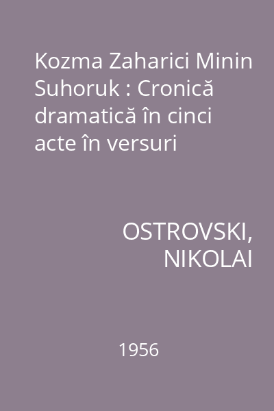 | Titlu | Kozma Zaharici Minin Suhoruk : Cronică dramatică în cinci acte în versuri |