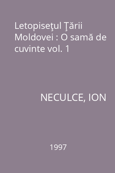 | Titlu | Letopiseţul Ţării Moldovei : O samă de cuvinte vol. 1 |