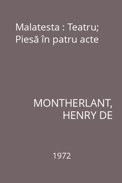 | Titlu | Malatesta : Teatru; Piesă în patru acte |