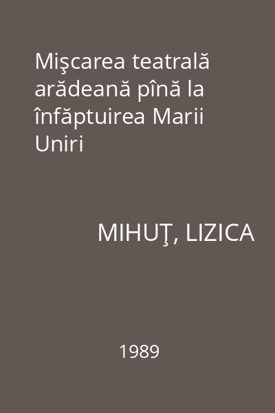 | Titlu | Mişcarea teatrală arădeană pînă la înfăptuirea Marii Uniri |