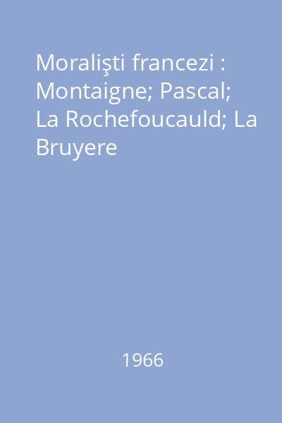 | Titlu | Moralişti francezi : Montaigne; Pascal; La Rochefoucauld; La Bruyere |