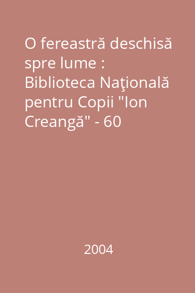 | Titlu | O fereastră deschisă spre lume : Biblioteca Naţională pentru Copii "Ion Creangă" - 60 |