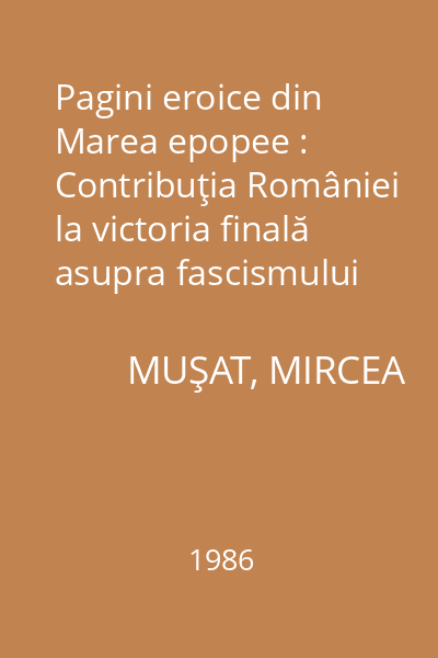 | Titlu | Pagini eroice din Marea epopee : Contribuţia României la victoria finală asupra fascismului |