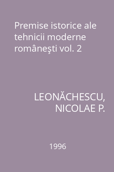 | Titlu | Premise istorice ale tehnicii moderne româneşti vol. 2 |