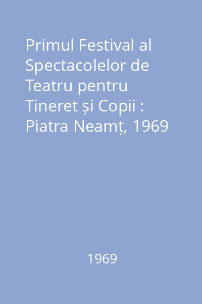 | Titlu | Primul Festival al Spectacolelor de Teatru pentru Tineret și Copii : Piatra Neamț, 1969 |
