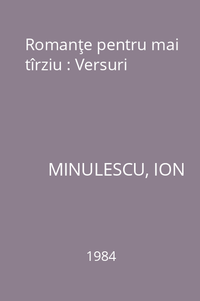 | Titlu | Romanţe pentru mai tîrziu : Versuri |
