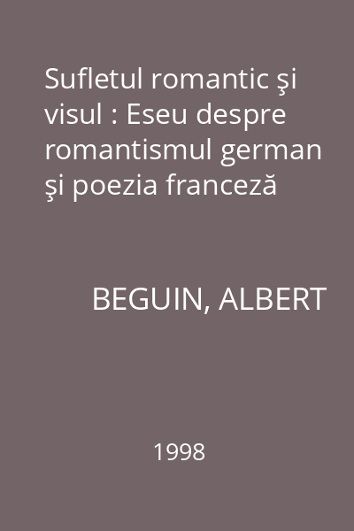 | Titlu | Sufletul romantic şi visul : Eseu despre romantismul german şi poezia franceză |